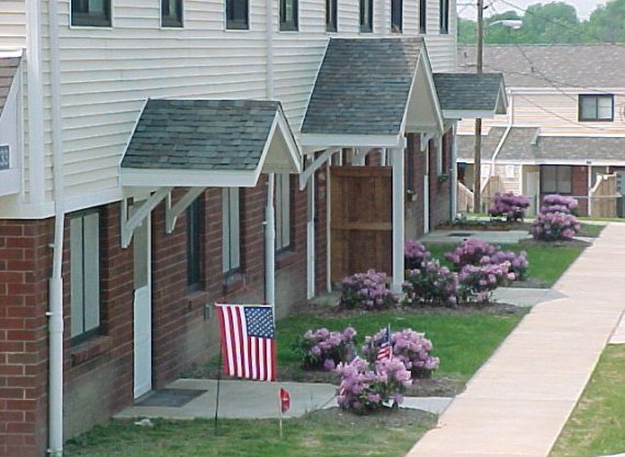 New parking areas provide improved access. Units have individual identities with new front porch roofs, screened entrances, covered rear stoops, private yards, and storage sheds.