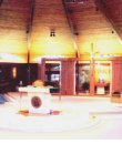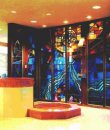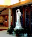 The Statue of the Good Shepherd is featured in front of a stained glass window in the Gathering Room and is highlighted by a skylight. |